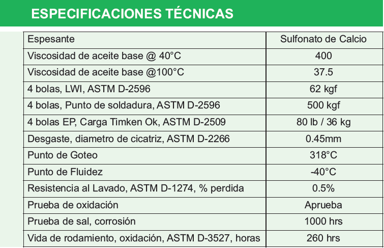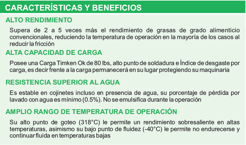 La Super FG aprovecha los beneficios del sulfonato de calcio junto con aditivos especiales para ofrecerle a sus equipos una excelente protección contra la herrumbre, temperatura y carga. Esta grasa ha demostrado su versatilidad y rendimiento incluso en industrias no alimentarias como son la industria textil, papelera y de corrugado de cartón.