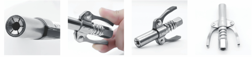 Doble mango con diseño antideslizante y mecanismo de retracción suave que permite un funcionamiento fácil sin la necesidad de una mano adicional para mantener el acople en su lugar al empujar al grasa. Una vez que se acopla a la grasera permanece conectado y libera ambas manos para operar la engrasadora